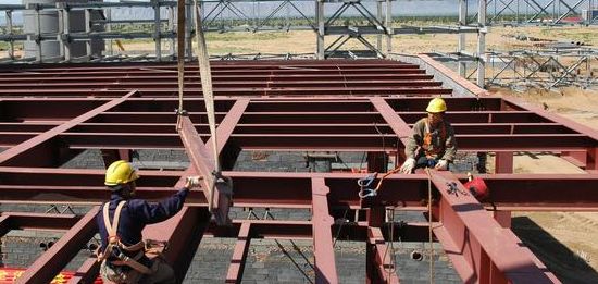 鋼梁吊裝前在鋼梁上裝上安全繩,起吊時在鋼梁的兩端分別掛兩根溜繩,兩個人分別拉住兩根溜繩,鋼梁開始起吊速度一定要慢。為了保證安全,人員不能站在梁的正下方。在鋼梁的兩端帶上專用放置高強度螺栓的布袋,待鋼梁吊至就位位置以上時,開始就位鋼梁,鋼梁下落速度控制在3米/分鐘,在鋼柱的柱頭兩端各安排兩名安裝工,準備安裝鋼梁。鋼梁接近就位位置時,兩名安裝工人要分別用手扶住鋼梁的上翼緣,將鋼梁拖至就位位置,準備安裝高強螺栓。